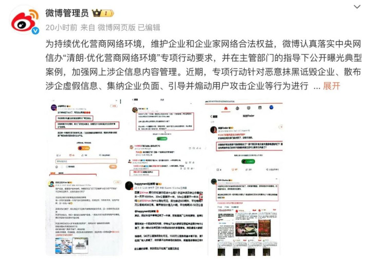 微博管理员发布消息称,近期,在落实网信办“清朗·优化营商网络环境”专项行动中,针对恶意抹黑诋毁企业、散布涉企虚假信息、集纳企业负面、引导并煽动用户攻击企业等行为进行重点打击,并责令对存在相关违规行为的多名汽车领域KOL用户予以禁言90天、禁止广告收益180天的处置。